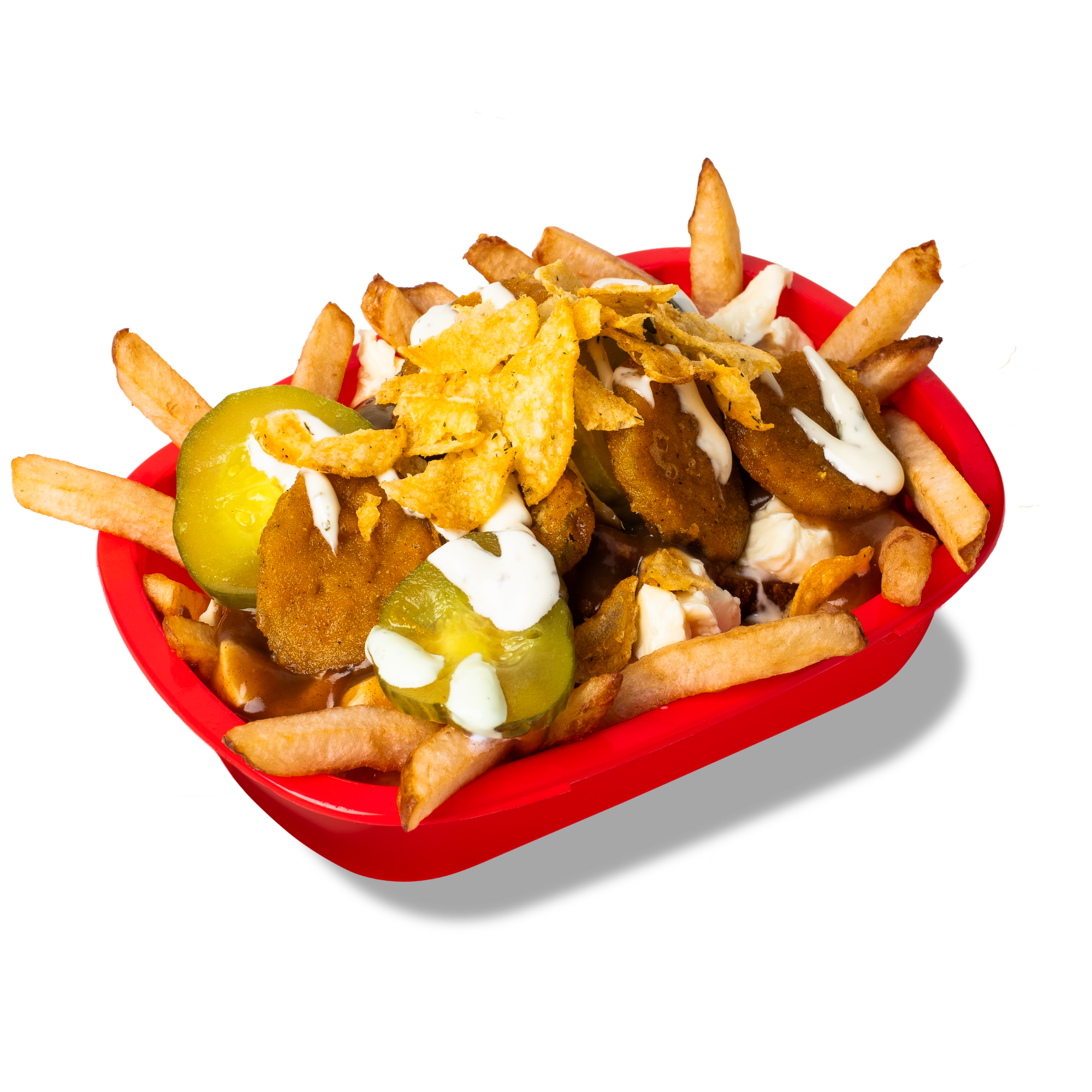 Fries, cheese curds, poutine gravy, fried pickle chips, dill pickle chips, pickle chips, and garlic and herb sauce.