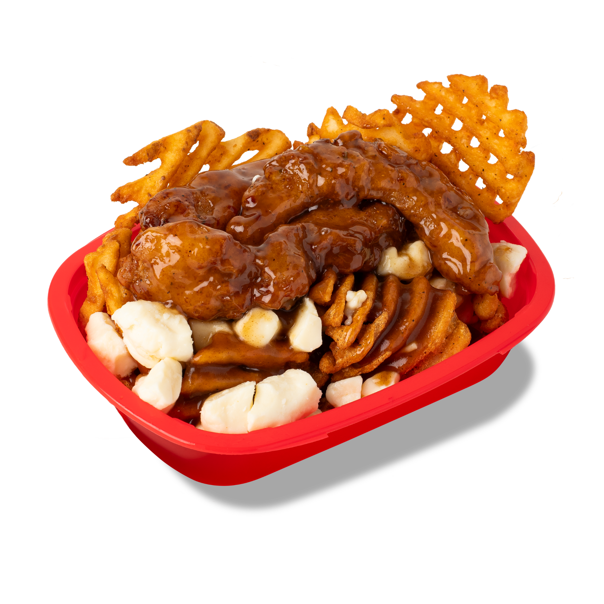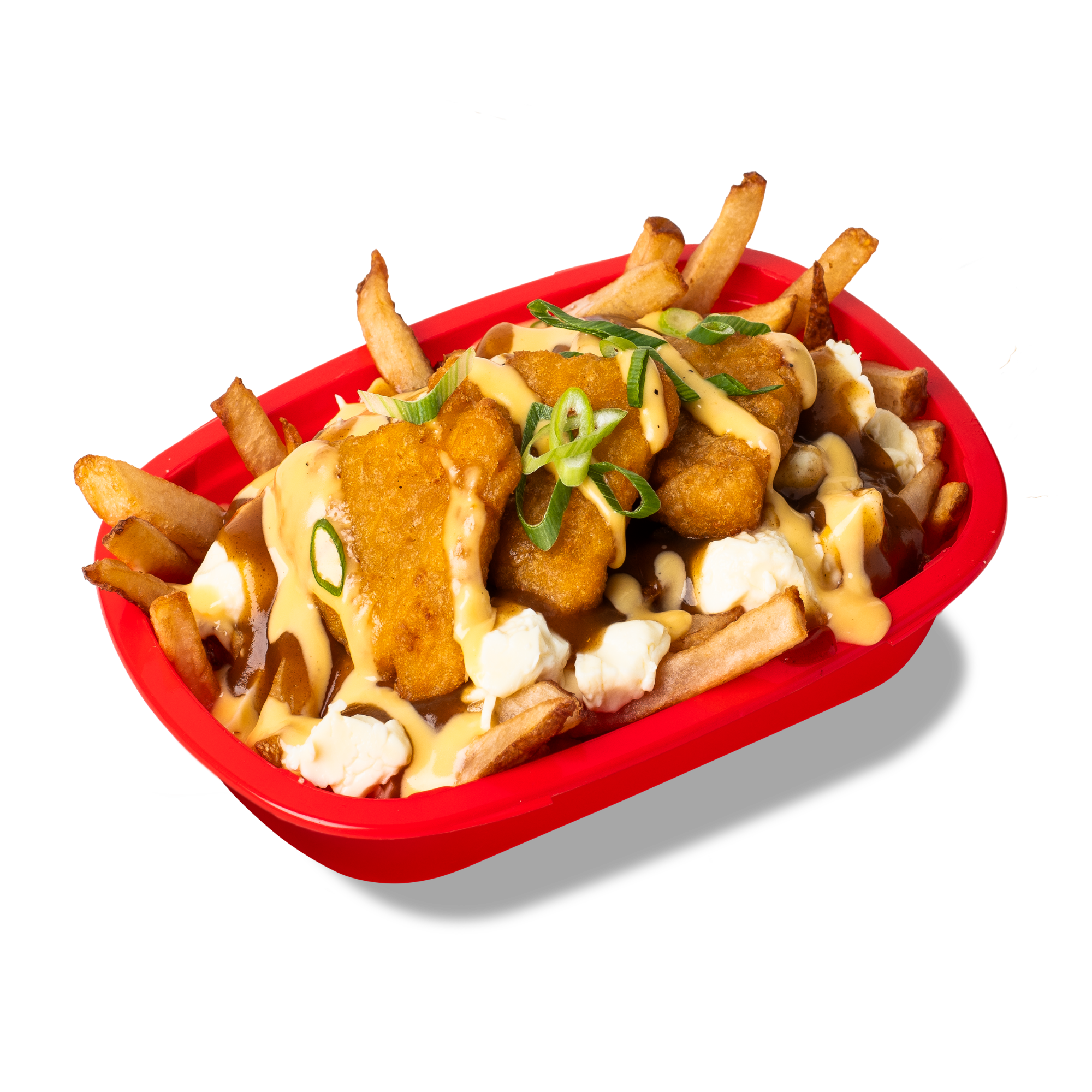 Waffle fries, cheese curds, poutine gravy, crispy chicken strips and spicy honey sauce.