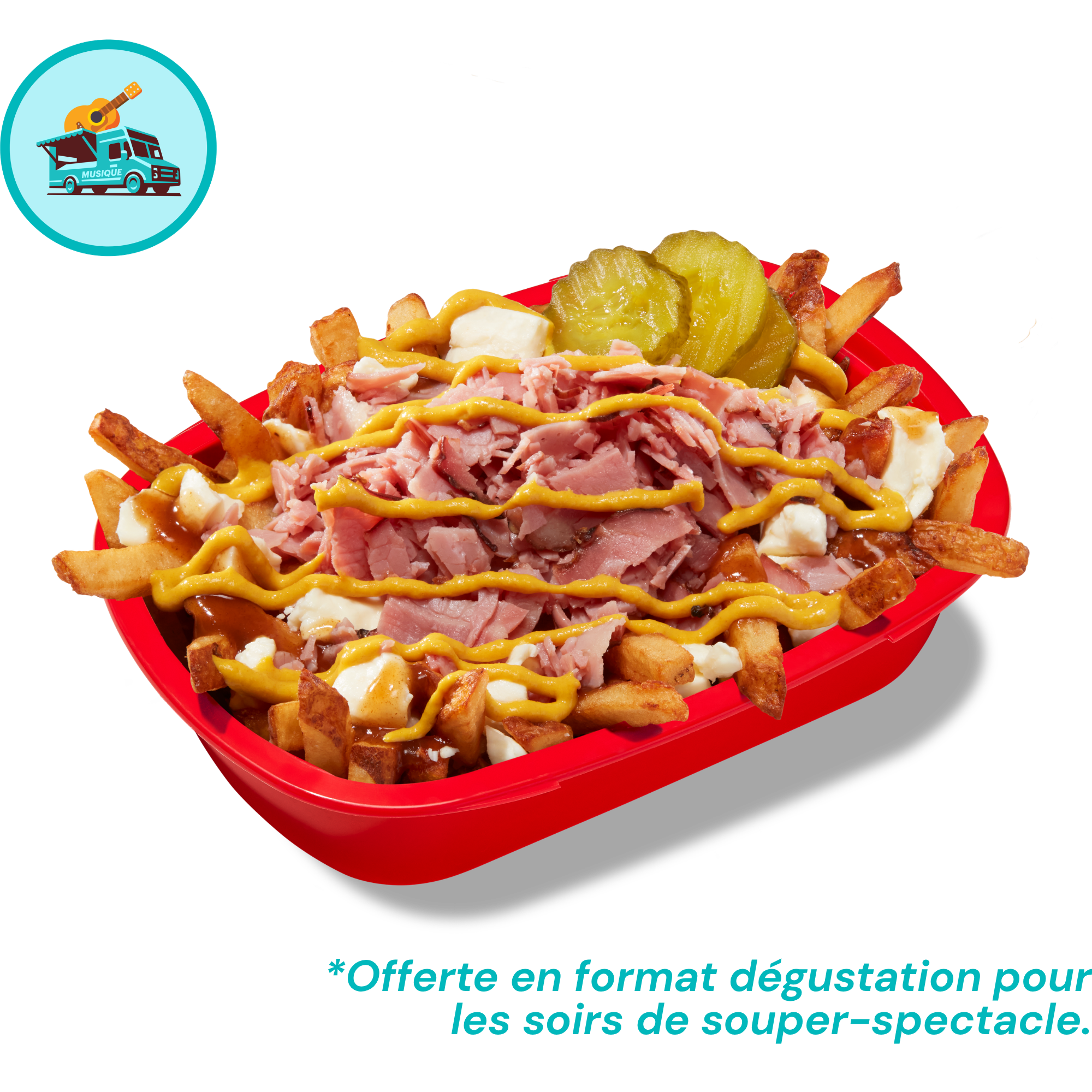 Fries, cheese curds, poutine sauce, smoked meat, sweet mustard, and pickles.
