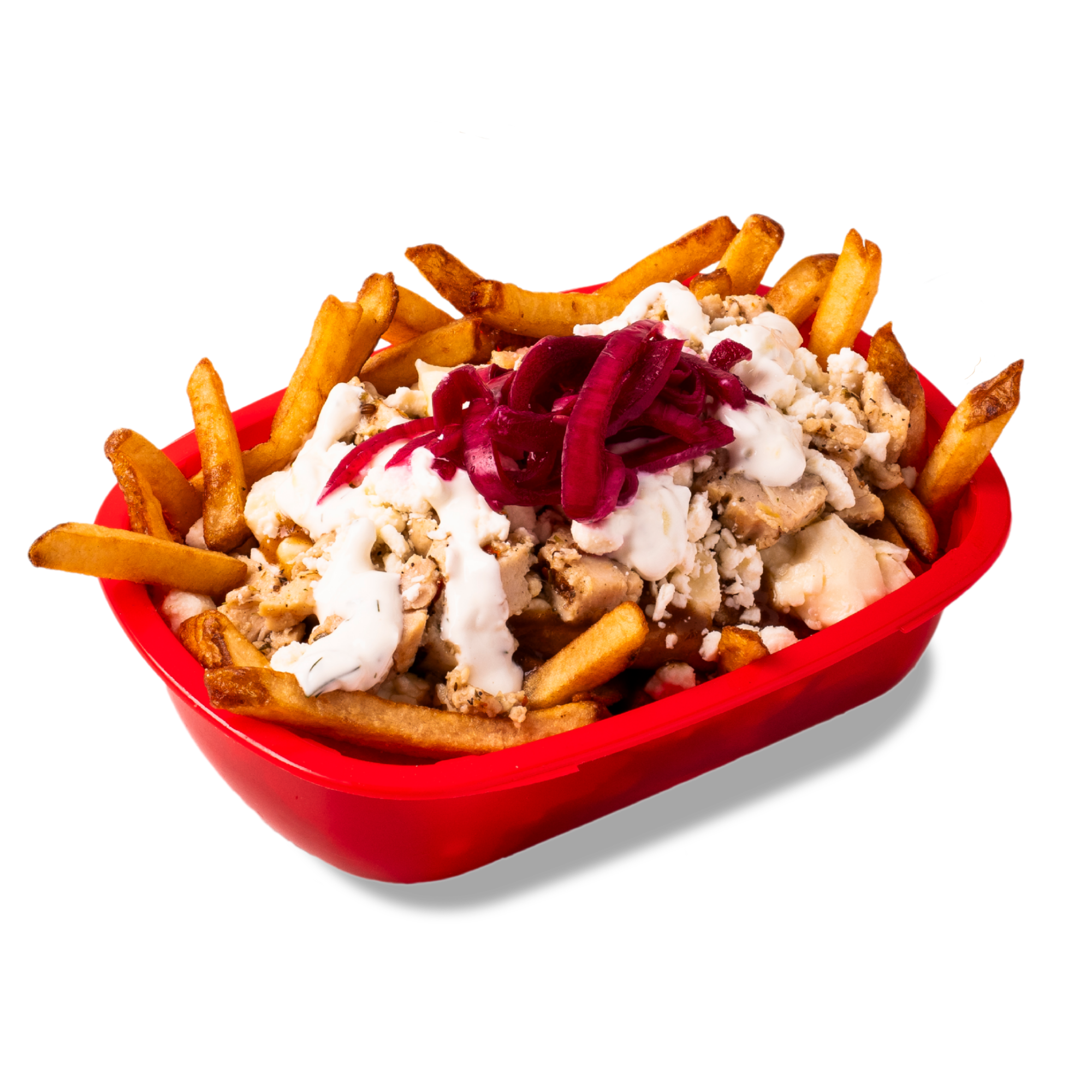 Fries, cheese curds, poutine gravy, grilled chicken, feta cheese, tzatziki sauce, and pickled red onions.