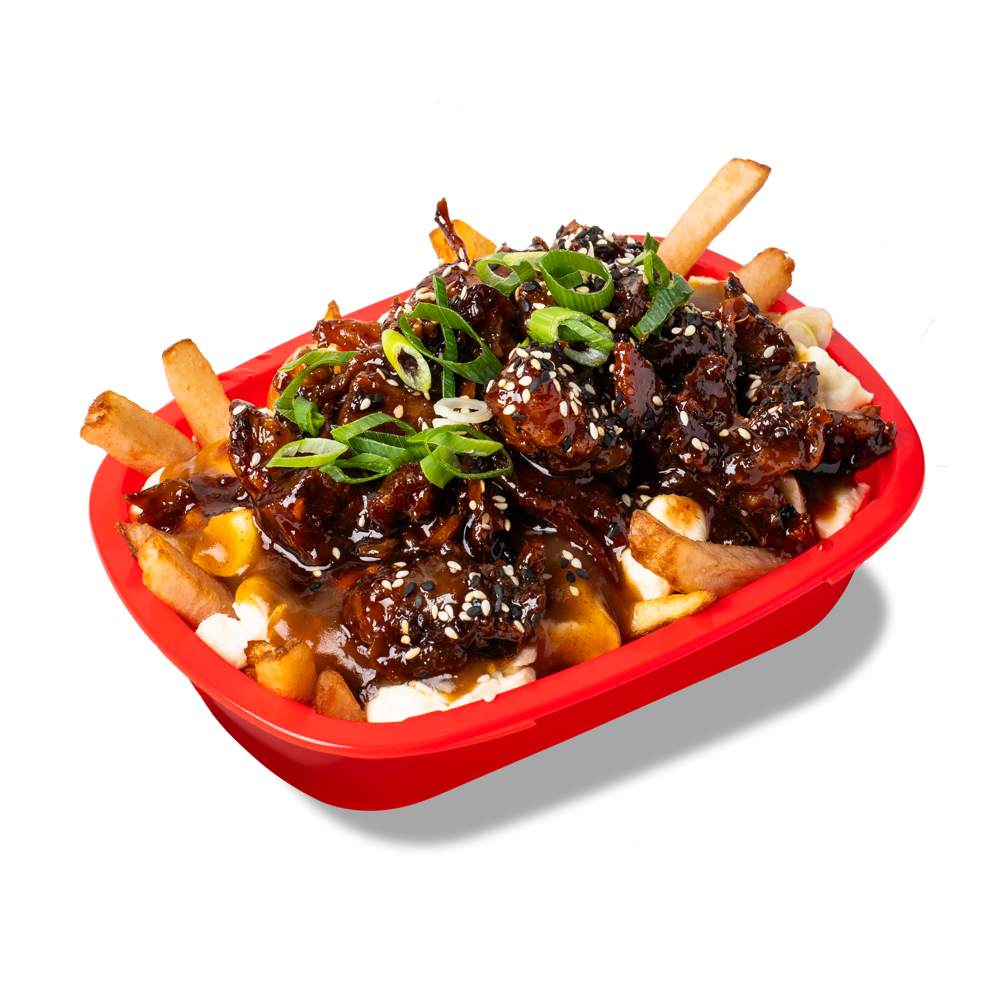 Fries, cheese curds, poutine sauce, Asian chicken balls, red cherry sauce, sesame seeds, and green onions.